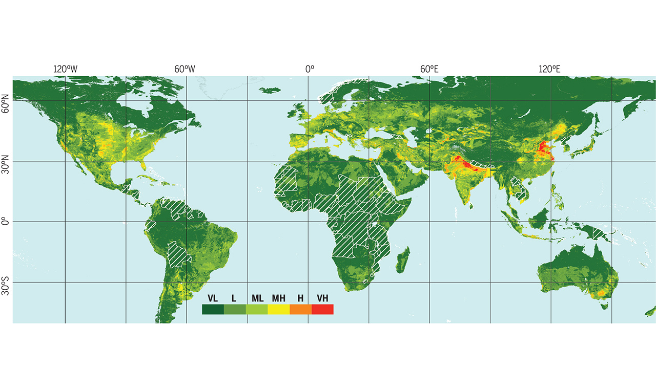 На карті зеленим кольором позначені райони з найнижчим ризиком просідання грунту, червоним - з найвищим ризиком. Як видно, найбільш складна ситуація складається на сході Китаю і в районі Гімалаїв. Високий ризик просідання грунту також у Європі, США, Південній Азії, на Близькому Сході.