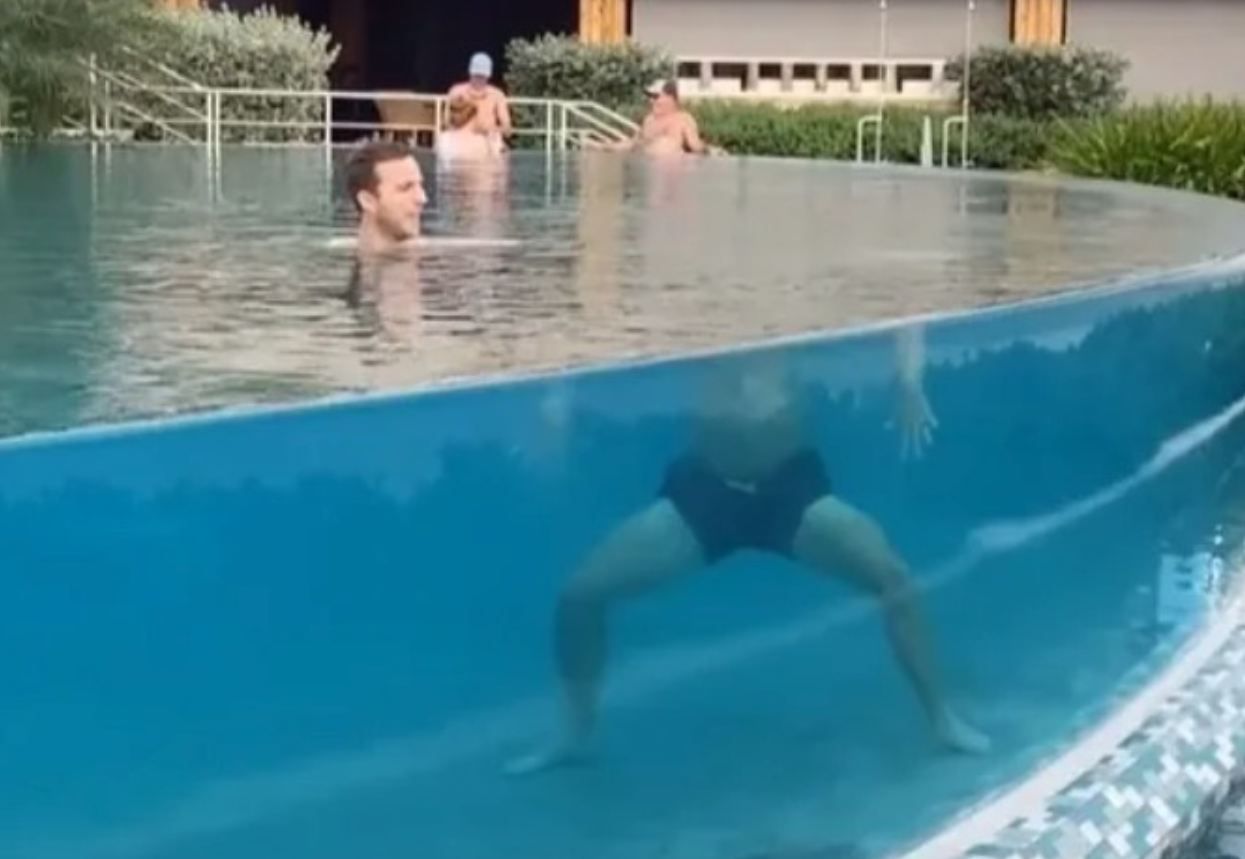 На відео видно, як чоловік плаває у басейні, при цьому через прозорі стінки круглого басейну видно, що його голова "відокремлена" від тіла.