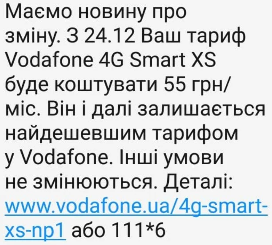 Абонентів попереджають, що з 24 грудня тариф Vodafone 4G Smart XS коштуватиме 55 грн на місяць. До цього щомісячна плата у межах цього тарифу становила 45 грн. на місяць, тобто подорожчання – близько 20%.