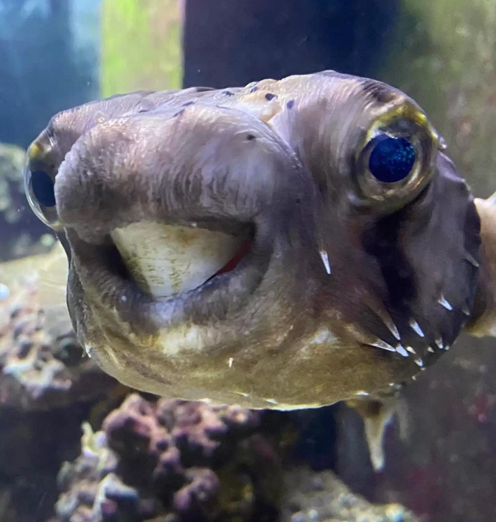 Риба фугу має особливу будову зубів - по суті, у неї один зрощений зуб, який постійно росте. У природному середовищі рибка вчасно стирає свій зуб об раковини, з яких видобуває молюсків для харчування.