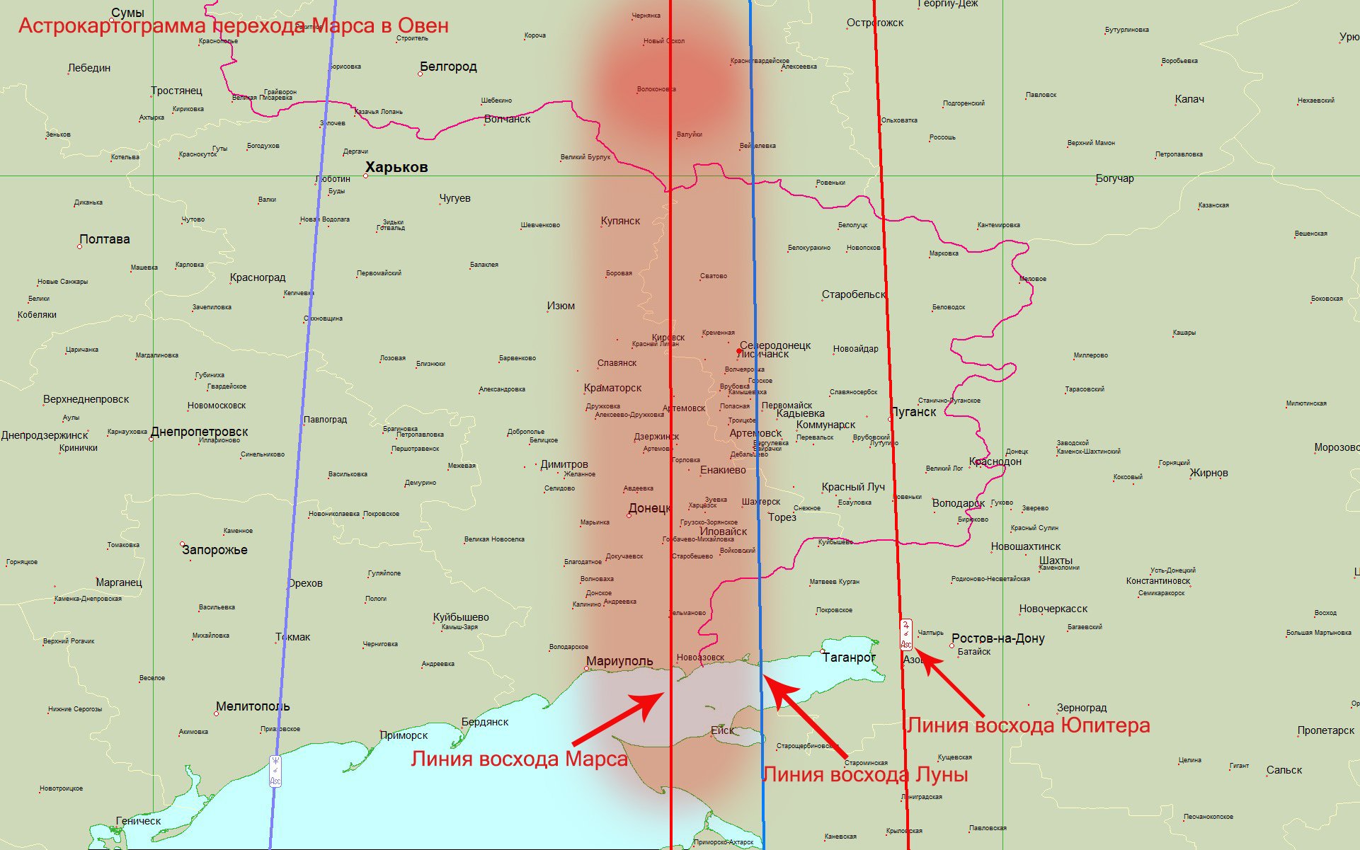 Де максимально виявляться ці енергії Марса? Астрокартографія (проекція положення планет на карту) дає відповідь. У точний момент переходу Марса в Овен, Марс і Місяць (перебувають у сполученні) будуть підніматися на сході України, точно на довготі 38E03. Це довгота Бахмута, Соледара, Сіверська, плюс мінус мінімум 50 км від цієї довготи, на схід і захід, покриваючи всі міста від Сєвєродонецька до Краматорська. На цю довготу (близько 38E03) бог війни Марс спрямує всю свою руйнівну силу, що дуже небезпечно насамперед для військових. Довгота 38 градусів до 5 липня є критичною лінією для України.