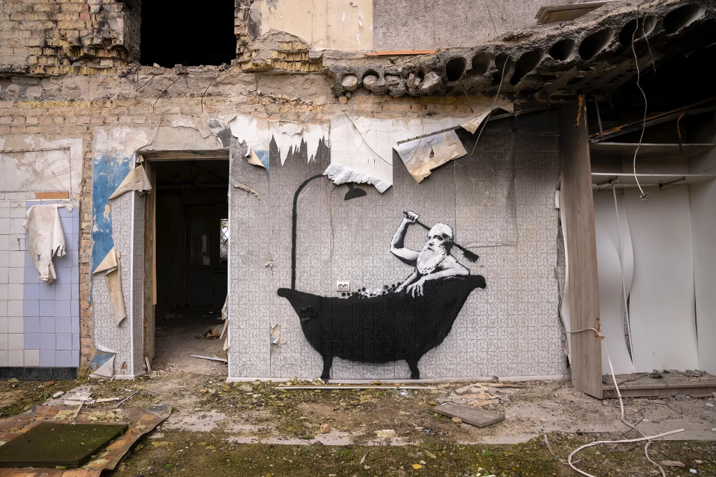 Ще одна робота Бенксі в Україні – чоловік, що приймає ванну.