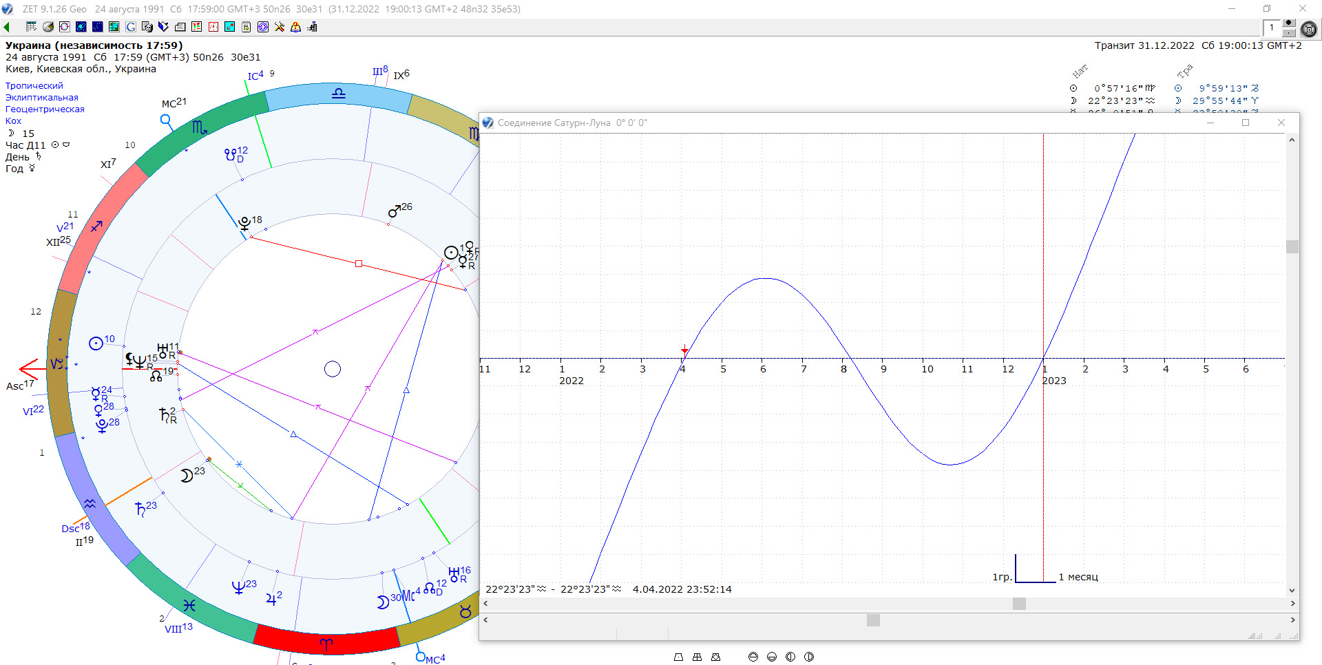 "Але найактивніший подійний аспект найближчих місяців - це поєднання прогресивного Меркурія з Марсом карти України, у 8 будинку. Пік його впливу буде в червні-липні 2023. Фактично це буде кульмінація війни. Даний аспект дасть найважчі активні бої, штурм ворожих позицій втрати як у противника, так і у нас. Так само він дасть велику військову допомогу іноземних партнерів, активний розвиток військового виробництва. Я думаю, що завдяки цьому аспекту Україні дадуть все необхідне для перемоги. Але я не впевнений, що ми повернемо всі окуповані території в 2023 році… Цікаво зауважити, що і опозиція транзитного Сатурна до Сонця, і гармонійний прогресивний аспект від Сонця до Сатурна карти України, розпадуться одночасно в другій половині лютого 2024 року! Аспект загрози і аспект захисту перестануть працювати одночасно! До лютого 2024 року, розпадеться аспект прогресивного Меркурія у поєднанні з Марсом, який вказує на найактивнішу фазу бойових дій. Може, до весни 2024 року і буде якась розв'язка у цій війні?", - зазначає Дмитро Уранус.