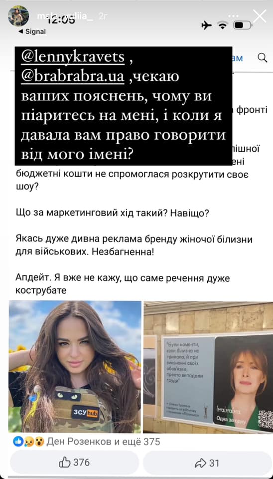 "Ми з brabrabra відповідаємо, якщо ви тут за цими відповідями, звичайно))) Підтримати збір Одна за одну на зручну білизну для жінок-військових можна у шапці профілю", - написала Кравець.