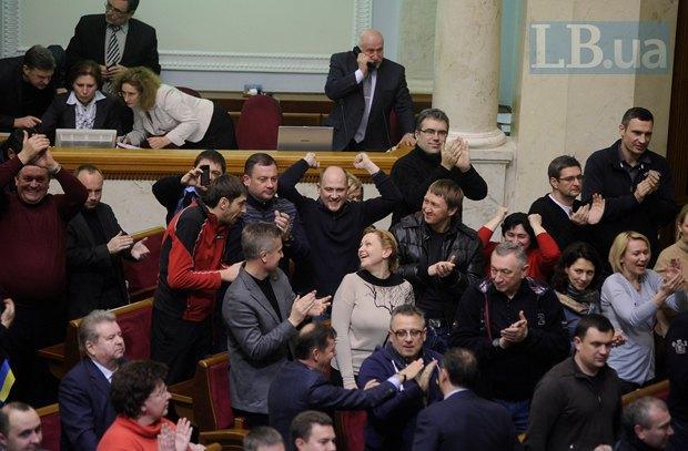 Депутаты ожидали окончания их выступления стоя. При этом кричали с мест: "Согласны. Голосуем".