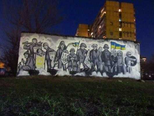 В Днепропетровске появилось первое граффити, посвященное украинским героям, погибшим в дни жестоких противостояний. Уличные художники перенесли на стену картину известного украинского художника Юрия Журавля "Небесная сотня".