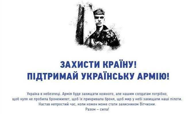 Защити страну! Поддержи украинскую армию! Украина в опасности. Армия будет защищать каждого, но нашим солдатам нужно, чтобы пуля не пробила бронежилет, чтобы их прикрывала броня, чтобы мир в небе защищали наши пилоты. Наступило непростое время, когда каждый может стать защитником Отечества. Вместе - сила!