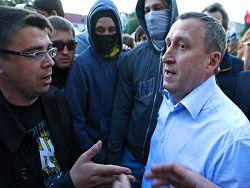 Очевидцы заметили, что один из камней бросил депутат Верховной Рады, председатель Социалистической партии Украины Николай Рудьковский. По данным «Росбалта», депутат выступил перед митингующими с заявлением по Крыму, который, по его мнению, должен быть украинским. После того как он закончил говорить, собравшиеся вручили ему булыжник и потребовали в знак солидарности с толпой бросить его в посольство. Рудьковский выполнил требование и уже направлялся к своему автомобилю Lexus, на котором приехал, когда его облили зеленкой и призвали пожертвовать машину нуждающимся украинцам. В итоге уезжать с митинга депутату пришлось на общественном транспорте. Как отмечает корреспондент «Украинской правды», после ухода Рудьковского толпа начала скандировать ту самую нецензурную речевку про Путина, периодически подставляя вместо имени российского президента имя лидера украинских социалистов.
