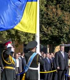 Президент Украины Петр Порошенко 23 августа принял участие в церемонии торжественного поднятия Государственного Флага Украины, которая состоялась на Софийской площади в Киеве.