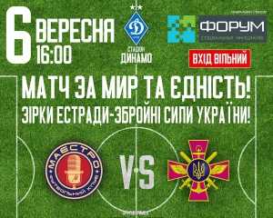 При поддержке Министерства культуры, Министерства молодежи и спорта и Вооруженных сил Украины на столичном стадионе «Динамо» им. В.Лобановского, рядом с которым во время Революции Достоинства (конца 2013-начала 2014 г.) шли противостояния, прошел символический «Матч за мир и единство». В поединке на поле приняли участие команд звезд эстрады и ВС Украины. Главная цель - собрать средства на нужды украинских военных, находящихся в зоне АТО.