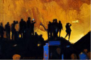 Напомним, Алексей Белюсенко является художником-реставратором, участником событий на Майдане, который художественно осмыслил собственный опыт. Поэтому выставка воспроизводит ряд зрительных образов героической истории Майдана, изображенных киевским художником на холсте масляными красками.
