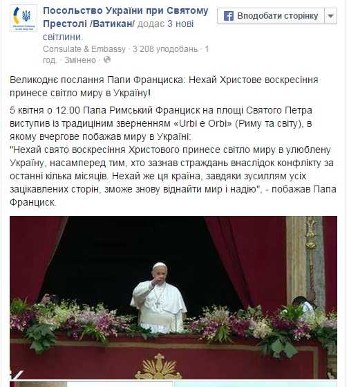 "Пусть Христово воскресение принесет свет в любимую Украину, прежде всего, тем, кто подвергся насилию от конфликта в последние месяцы. Пусть эта страна сможет заново найти мир и надежду благодаря усилиям всех заинтересованных сторон", — сказал понтифик.