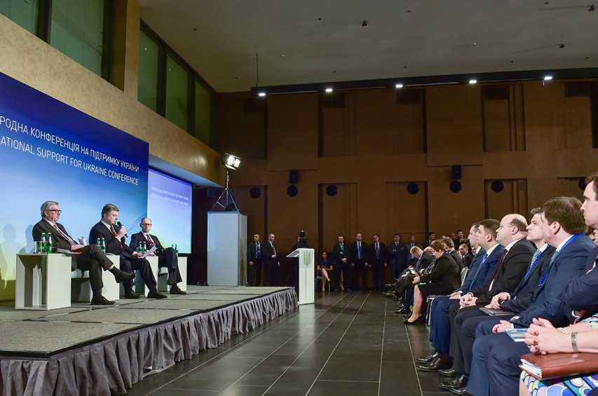Премьер-министр Украины Арсений Яценюк во время Конференции подчеркнул, что для достижения экономического роста необходимо привлечь в украинскую экономику инвестиции: «Лучший «план Маршалла» в этом случае – инвестируйте в Украину».
