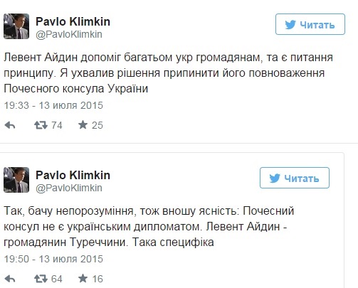 "Левент Айдын помог многим украинским гражданам, но есть вопрос принципа. Я принял решение прекратить его полномочия почетного консула Украины", – сообщил министр.