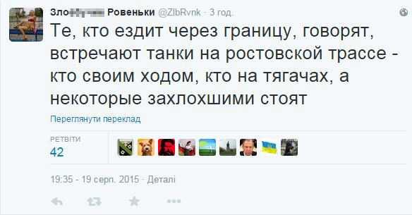 По словам интернет-пользователей из-за движения колонны, которая приближается по Ростовской трассе к Изварино, был отменен автобус Луганск-Киев. Также они сообщили, что в Ростовской области замечены танки, при этом некоторые из них движутся своим ходом, некоторые — на тягачах, а другие стоят заглохшие.