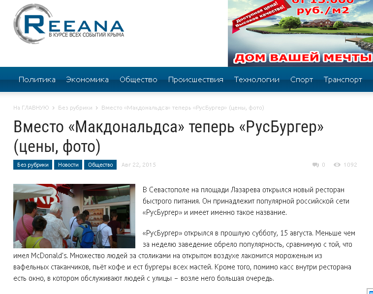 В Севастополе по прошествии одного года на месте бывшего МакДональдза российские предприниматели презентовали «аналог» «РусБургер».