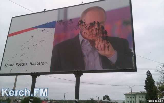 В Крыму в спальном районе Керчи билборд с изображением президента России запачкали черной краской.