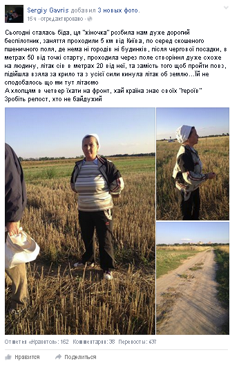 Во время проходящих учебных полетов украинка, возле которой в 20 метрах на поле приземлился беспилотник, подняла и швырнула его на землю. При этом техника бесповоротно разбилась.