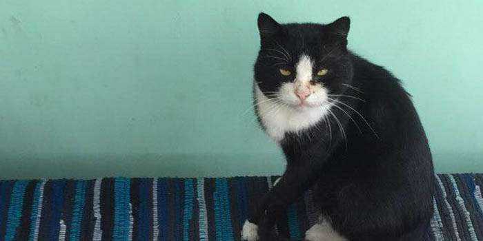 На фото изображен обычный черно-белый кот, который сидит на скамье. Рядом – стол, накрытый украинской скатертью.