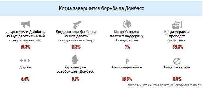 Граждане Украины склонны считать, что борьба за оккупированный Донбасс закончится, когда сами жители региона начнут выступать против российской агрессии. В то же время несколько реже начали поступать призывы к полной блокаде захваченных территорий.