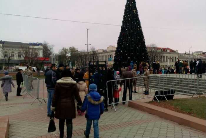 На главной площади аннексированного Симферополя оккупанты установили главную елку Крымского полуострова. Крымчанам, которые желают подойти к елке, необходимо пройти через металлоискатель.