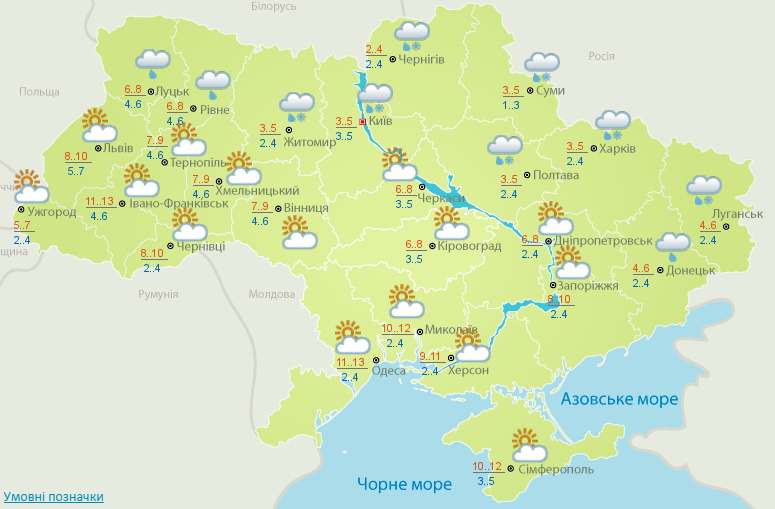 В центре, на западе и юге страны ожидается переменная облачность. На севере и востоке Украины синоптики прогнозируют мелкий дождь и мокрый снег.