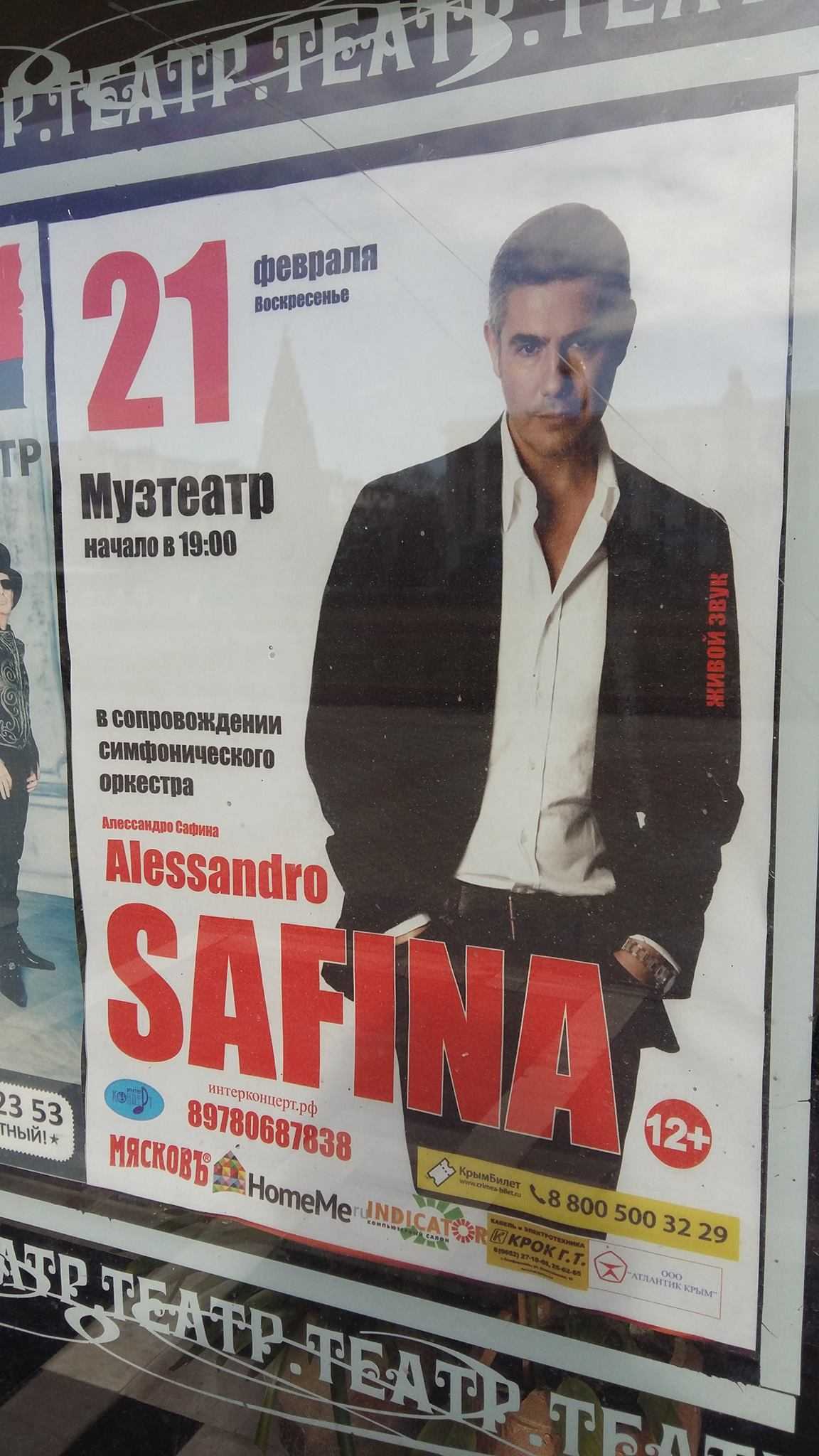 Как сообщалось, в аннексированном Крыму в Симферополе запланирован концерт итальянского оперного и эстрадного певца Алессандро Сафина. Концерт пройдет 21 февраля в Академическом музыкальном театре. Организатором концерта выступает ООО «Интерконцерт». С момента аннексии Крыма итальянец дает на полуострове уже не первый концерт.