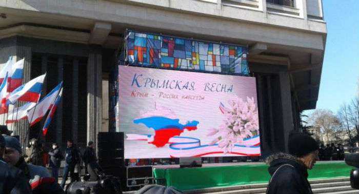 На площади у крымского парламента оккупанты установили огромный экран, на котором начали транслировать кадры событий Евромайдана в Киеве. Тут же начался митинг и концерт.
