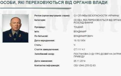 Владимир Тоцкий в ноябре 2013 года был назначен Виктором Януковичем на должность руководителя Антитеррористического центра при СБУ и жил в Киеве. В 2015 году Служба безопасности Украины объявила в розыск экс-главу Антитеррористического центра Владимира Тоцкого, который обвиняется по ч. 1 ст. 111 (государственная измена) Уголовного кодекса Украины и в ноябре 2014 года скрылся от правосудия в неизвестном направлении.