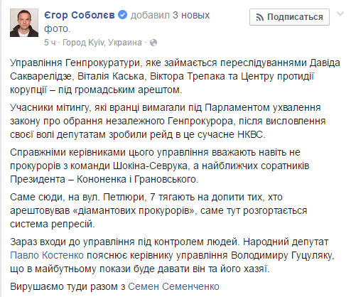 По словам Соболева, митингующие, которые утром вторника, 19 апреля, требовали принятия закона о выборе независимого генерального прокурора, после изъявления своего желания "осуществили рейд в это современное НКВД".