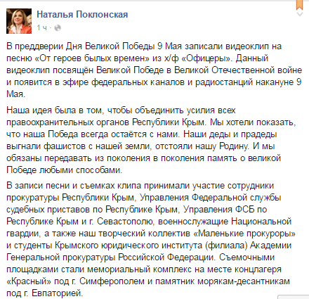 В своем "Фейсбуке" прокурор рассказала, что ролик выйдет в преддверии праздника. В съемках клипа приняли участие сотрудники Прокуратуры Крыма, регионального управления ФСБ, службы судебных приставов, группа "Маленькие прокуроры" и учащиеся Крымской академии прокуратуры.