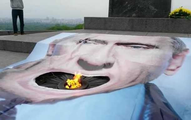 В Киеве в парке Славы у Могилы Неизвестного солдата активисты накрыли Вечный огонь большим плакатом с изображением президента России Владимира Путина.