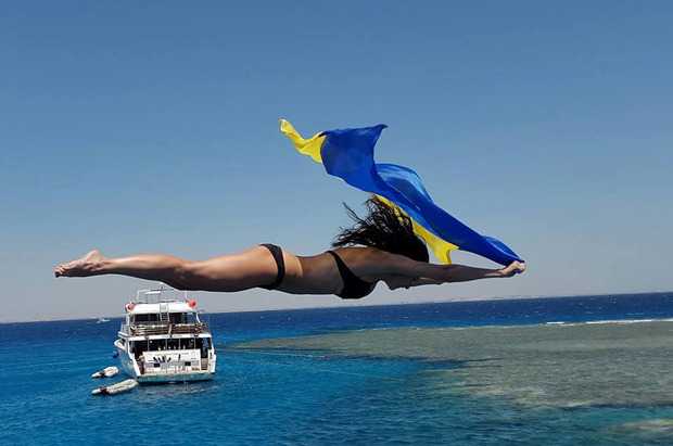 Украинский волонтер Марина Комарова вызвала восторг в «Фейсбуке» фотографией своего прыжка с флагом Украины.
