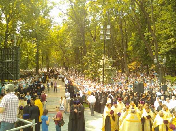 Кульминацией трехнедельной акции Украинской православной церкви Московского патриархата стала встреча восточного и западного крыла Крестного хода на Владимирской горке и молебен. Затем начался проход к Киево-Печерской лавре.