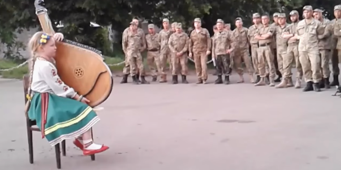 На видео видно, как девочка, одетая в национальный костюм, под аккомпанемент бандуры рассказывает стихи на украинском языке.