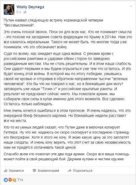 "Судя по всему, нас ожидает еще одна война. С реками крови с российскими ракетами и ударами обеих сторон по заведомо разведанным местам. Мы не столь решительны. И в этом наша слабость. Они ударят первыми и мы будем огрызаться уже тем что осталось. И это будет конец этой войны. В которой мы по итогу победим, умывшись своей же кровью и отправив в обратном направлении тысячи "зеленых человечков". Кто бы что ни говорил о нас, но в ближайшие дни могут заговорить уже наши "Точки-У" и российские крылатые ракеты. И результат не предскажет сейчас никто. Мы помогали армии, мы собирали свои силы в кулак именно для этого момента. Все сделано. Осталось только наблюдать.