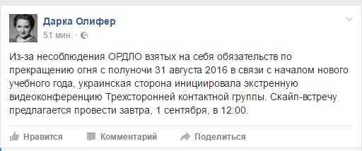 В связи с этим, украинская сторона выступила с инициативой провести видеоконференцию Трехсторонней контактной группы. Об этом сообщила пресс-секретарь представителя Украины на переговорах Леонида Кучмы Дарья Олифер в Фейсбуке, эту новость передает Час Пик.