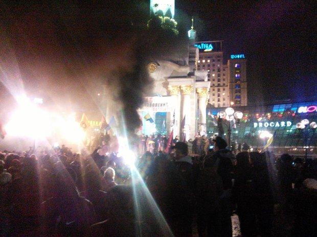 Активисты сначала пытались пронести шины на Европейскую площадь, а позже вернулись на Майдан Независимости, зажгли файеры и выступают на импровизированной сцене.