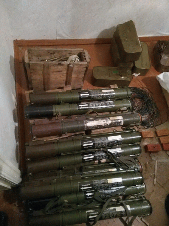 Всего из тайника правоохранители изъяли одиннадцать РПГ-22, РПГ-18, два РПГ-26, четыре тротиловые шашки весом 200 гр каждая, тротиловую шашку весом 400 гр, 30 гранат ВОГ к под ствольного гранатомета, две реактивные двигатели к ручному гранатомету ПГ, 2 заряды к РПГ-7, 5412 патронов калибра 5,45, 134 патрона калибра 12,7 мм, 1076 патронов калибра 7,62 мм.