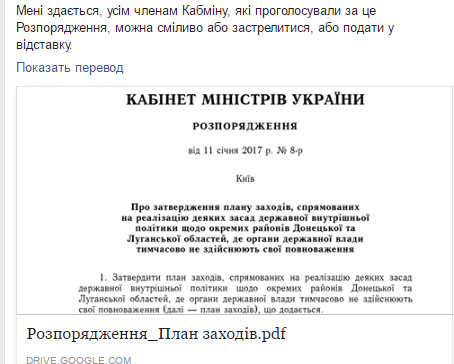 “Мне кажется, всем членам Кабмина, которые проголосовали за это Распоряжение, можно смело или застрелиться, или подать в отставку”, - резюмировал дипломат.