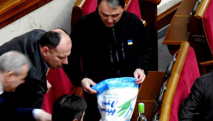 Лапин в пакете фонда «Новый Луцк» принес в Верховную Раду Украины сепаратистское водку и сигареты. Утверждает, что купил их на территории Украины, подконтрольной Киеву. Он продемонстрировал продукцию другим нардепам.