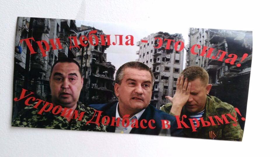 В Коктебеле и Феодосии неизвестные украинские патриоты "украсили" общественные места множеством листовок с изображением Аксенова, Захарченко и Плотницкого. Листовки жестко высмеивают изображенную на них троицу.