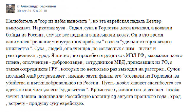 То есть, "Беса" втянули в большую кремлевскую многоходовочку, и он почувствовал себя политиком. Но у них там уже был один политик - Гиркин-Стрелков. И у этих пауков в банке началась личная грызня. В этой связи интересно читать "воспоминания" самого Безлера, который для своих изысков использует аккаунт своей жены Шутенко-Безлер в ВКонтакте. Бес просто ненавидит Стрелкова-Гиркина.
