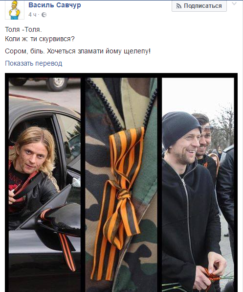 "По поводу футболиста Анатолия Тимощука. Независимо от мотивов, ношение георгиевской ленты в условиях российской агрессии следует законодательно приравнять к публичной демонстрации серпа с молотом или свастики. Под георгиевской лентой убивали и продолжают убивать украинцев, потому этот символ неприемлем для любого нормального человека. Любой, носящий этот символ убийц и садистов, автоматически публично выражает поддержку их преступлений" - пишет Березовец в Фейсбуке.