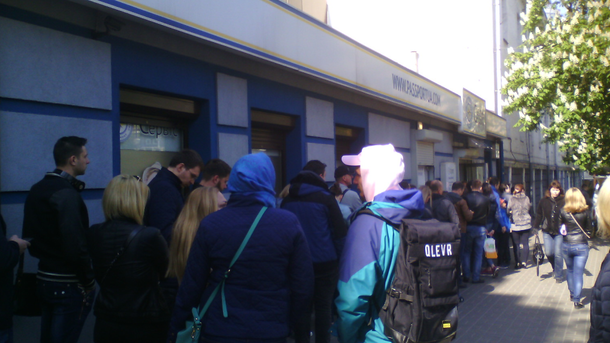После утверждения Евросоюзом безвизового режима для Украины, украинцы ринулись оформлять биометрические заграничные паспорта. Очередь за пластиковой корочкой, с которой возможны безвизовые путешествия, жители Украины занимают с 6 утра.