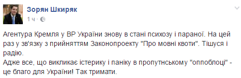 Советник главы МВД Зорян Шкиряк отметил, что в связи с принятием закона о языковых квотах «агентура Кремля в ВР Украины снова в состоянии психоза и паранойи».