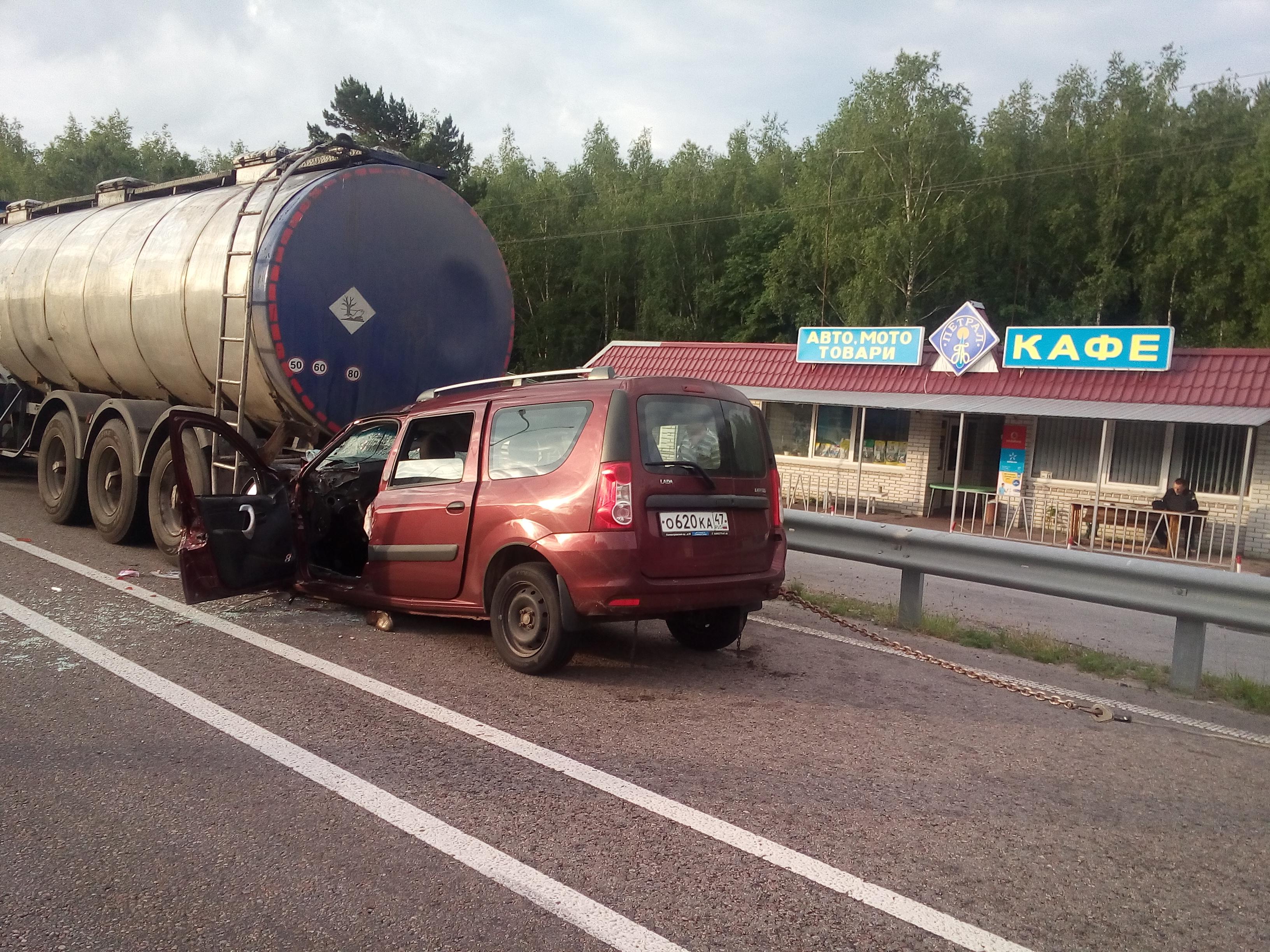 По прибытию спасателей на место происшествия установлено, что водитель автомобиля ВАЗ Largus не справившись с управлением, совершил наезд на автоцистерну DAF стоявшую на обочине. В результате столкновения водитель и пассажир автомобиля ВАЗ Largus были зажаты в середине автомобиля. Спасатели были проведены деблокирования пострадавших. С помощью лебедки был извлечен автомобиль ВАЗ Largus из-под задней части автоцистерны.