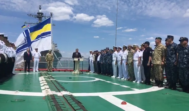 Сегодня, 17 июля, Порошенко пребывает с рабочей поездкой в Одесской области, в ходе которой посетил учения "Си Бриз-2017" в Одессе и произнес речь на борту флагмана ВМС Украины "Гетман Сагайдачный".