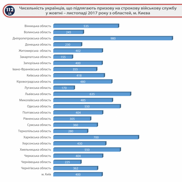 Из Донецкой области призовут 230 человек, из Луганской — 170 и наименьший план поставили Закарпатской области (155 человек).