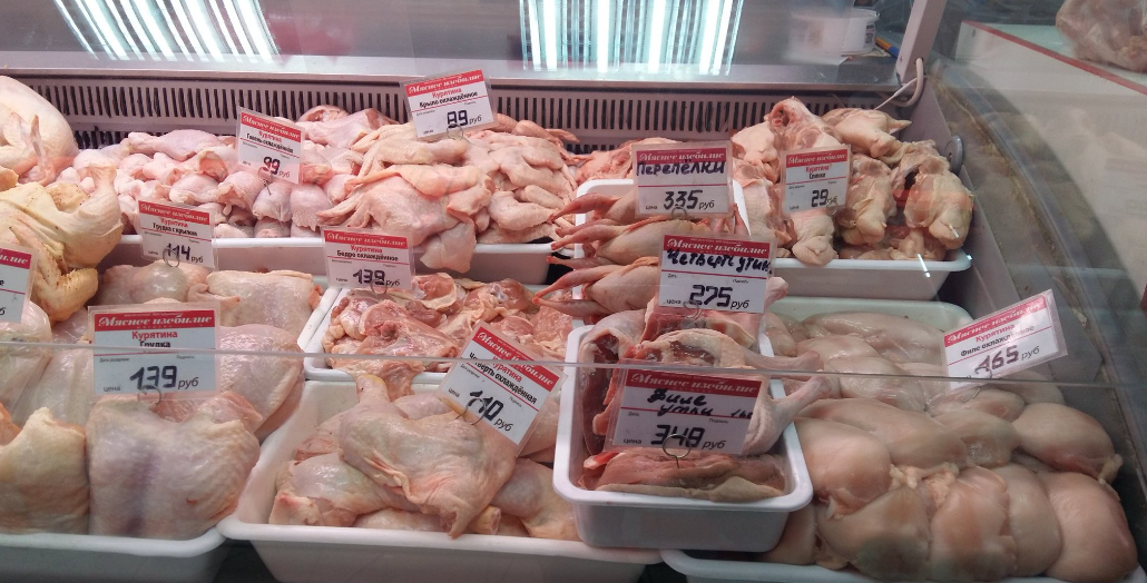 Так, например, свиную мякоть на кости в Донецке можно купить за 229 рублей за кг, свиной гуляш - 273 р/кг, отбивную свиную на кости за 245 р. за кг, четверть куриную за 110 р., голень куриную за 99 р., грудку куриную - 139р., филе куриное - 165 р. Цена за килограмм говядины колеблется от 235 р. до 289 р.